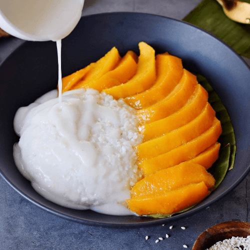 Fresh mango on top of sweet coconut sticky rice. Seasonal!