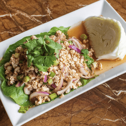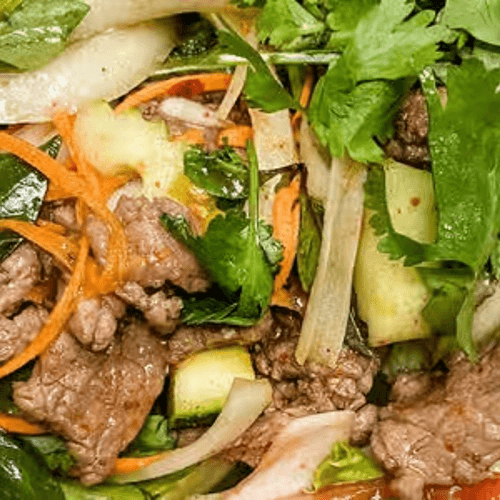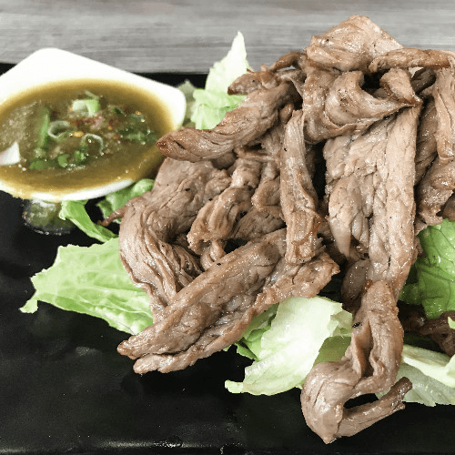 Grilled marinated steak served on lettuce with spicy lemongrass sauce. Spicy