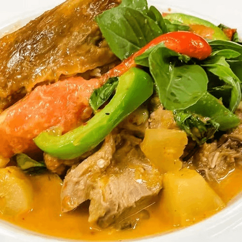 Potatoes, onions, cashews, and peanuts in coconut cream with tamarind. Spicy