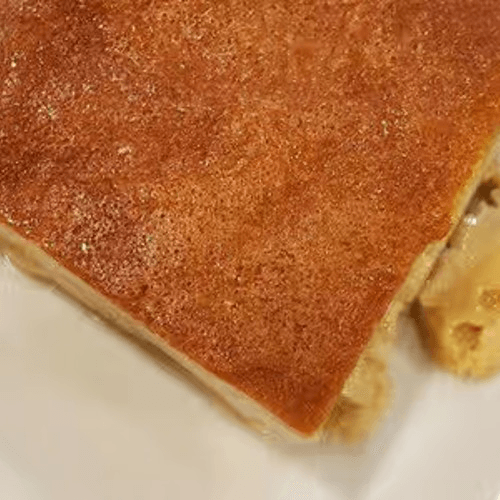 A piece of our homemade Thai custard on top of our sweet sticky rice
