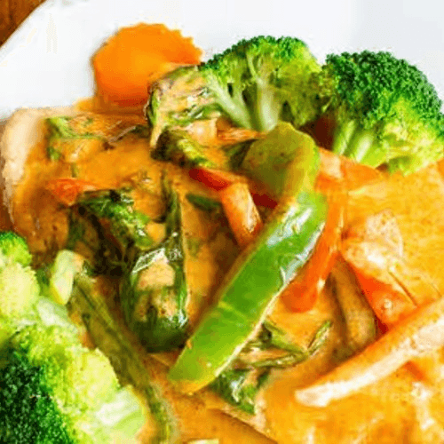 Sauteed green beans and bell peppers in curry paste with kaffir lime leaves. Spicy