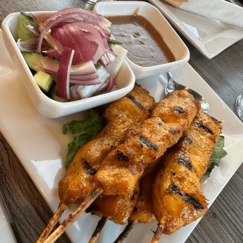 5 pieces of grilled chicken skewers, served with peanut sauce and cucumber salad