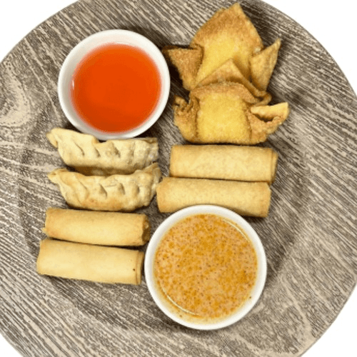 Assortment of 2 crispy spring rolls, 2 crab rangoon, 2 cheese rolls, and 2 curry potstickers