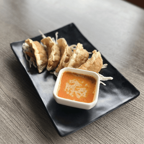 5 pieces crispy potstickers stuffed with chicken, served with our panang curry sauce. Spicy