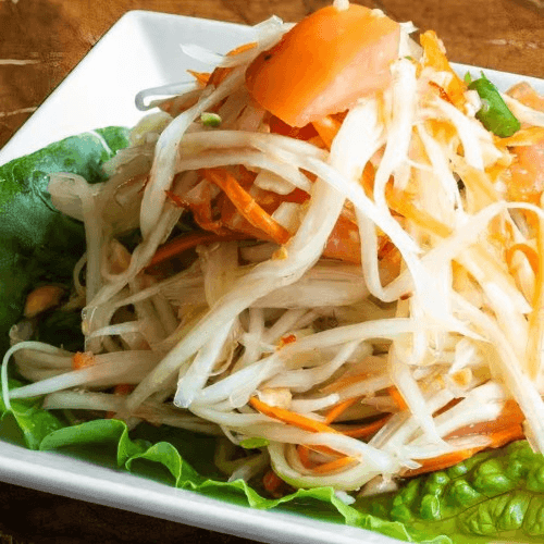 Shredded papaya, green beans, carrots, peanuts, and tomato in lime juice. Spicy